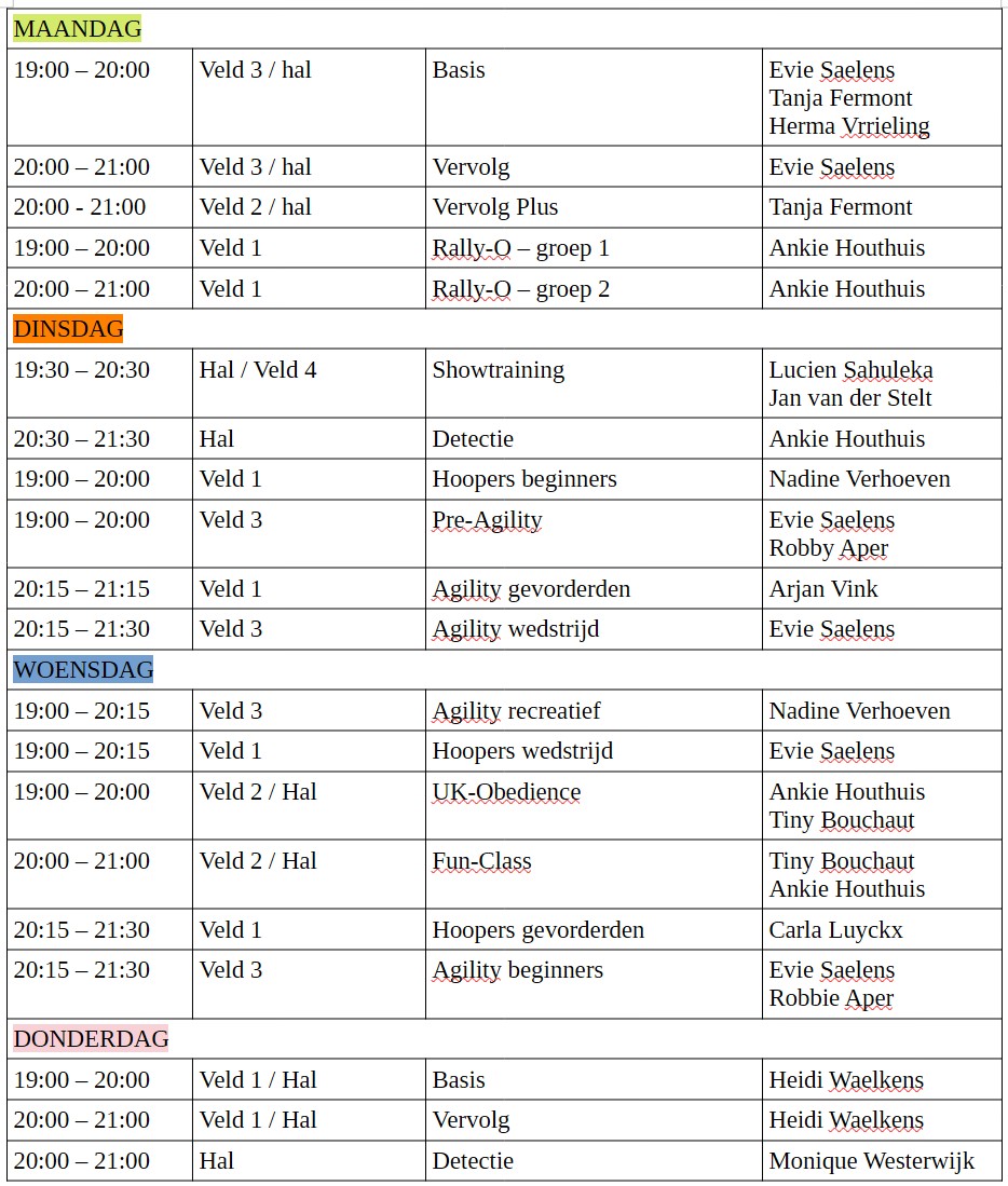 De Rally-O lessen worden buiten gegeven buiten, zorg voor gepaste kledij. Houdt rekening met de vacht van de hond en doe desnoods een (regen)jas aan.